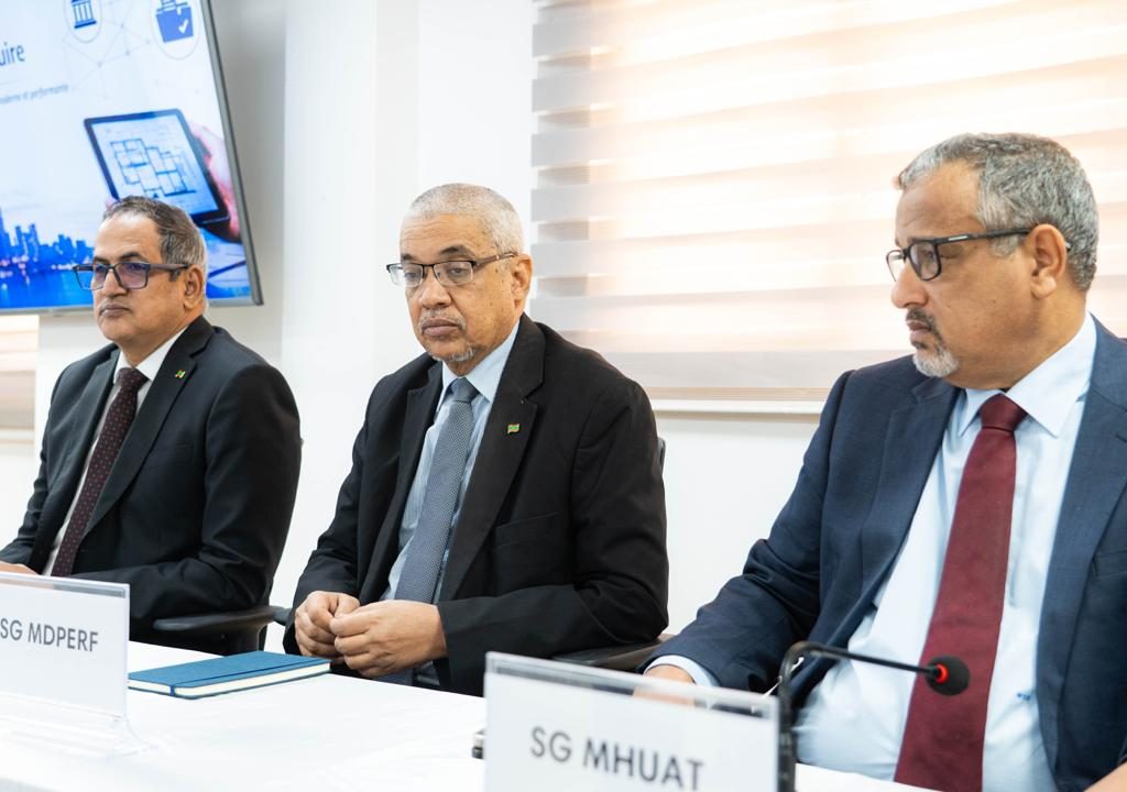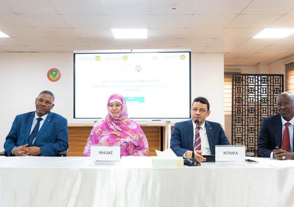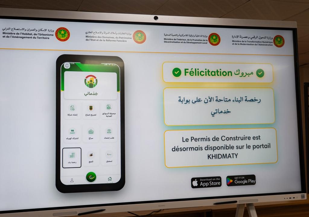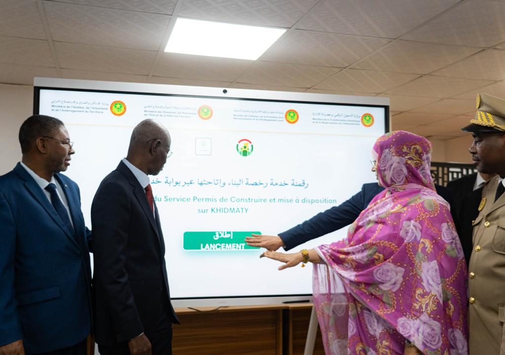 Le Ministre de la Transformation numérique et de la Modernisation de l’Administration, Monsieur Ahmed Salem Bede ; le Ministre des Domaines, du Patrimoine de l’État et de la Réforme Foncière, Monsieur Mamoudou Mamadou Niang ; la Ministre de l’Habitat, de l’Urbanisme et de l’Aménagement du Territoire, Madame Naha Hamdi Mouknass, et le Ministre délégué auprès du Ministre de l’Intérieur, de la Promotion de la Décentralisation et du Développement Local, chargé de la Décentralisation et du Développement Local, Monsieur Yacoub Salem Vall, ont lancé aujourd’hui la mise en ligne sur Khidmaty, du service d’obtention du Permis de Construire dans les trois wilayas de Nouakchott.